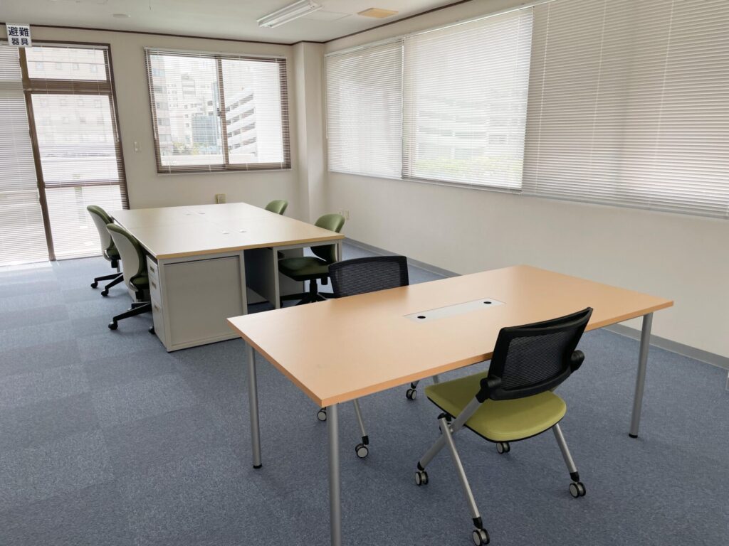 ・会議室家具:基本の6名に加え、頑張れば8名まで着席できるサイズを確保し、移動やレイアウト変更がしやすいよう、木目の天板の会議テーブルと、お客様のご予算やお好みに合わせたグリーンのキャスター付きチェアを選定・納品しました。