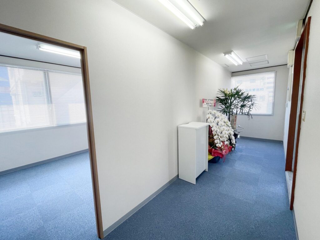 ・間仕切り壁:クロスは、元々のビル壁の色に合わせて白を採用。統一感を持たせ、清潔で明るい印象に仕上げました。