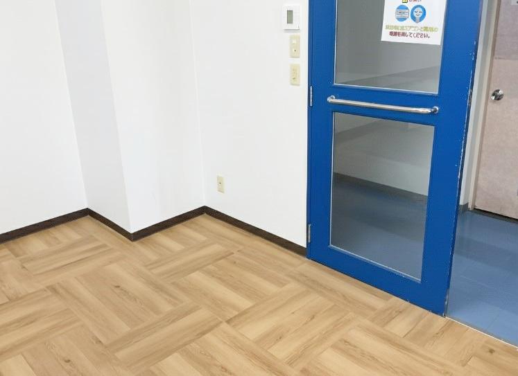 休憩エリアも、執務室と同じ木目調の塩ビタイルを、既存の床の上に直接貼り付ける形で施工し、統一感を出しました。注意したところは、床材の厚みが増すことで、ドアの開閉に支障をきたす可能性があったため、今回はドア下部をカットし、スムーズな開閉を可能にする調整を行いました。