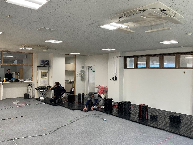 2.その上に、約300mm角の連結できるOAフロア用置敷きを一つずつはめ込んでいきました。柱などの障害物がある部分は、その形状に合わせて置敷きをカットし、隙間なく丁寧に施工しました。