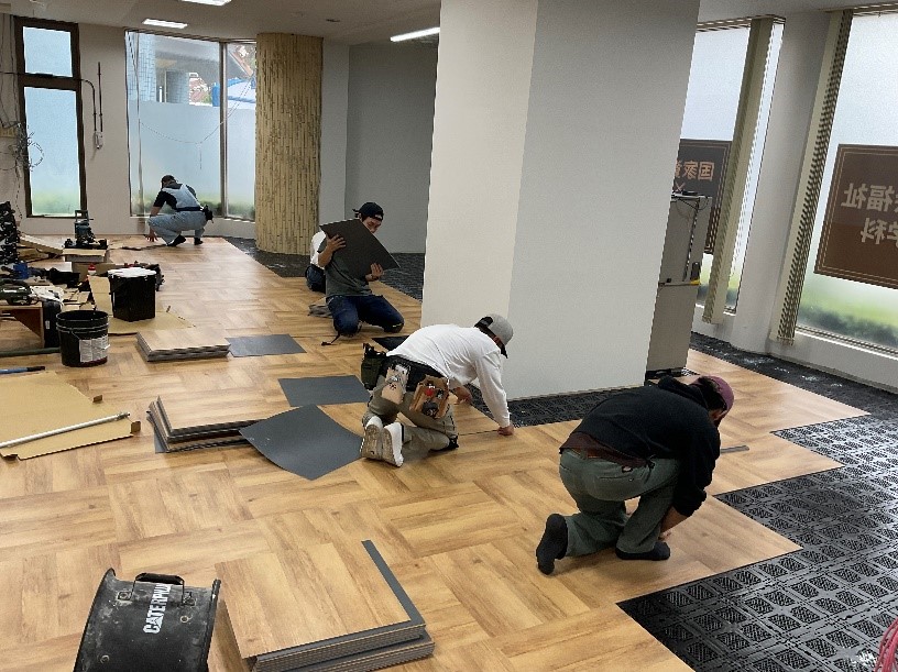 【休憩エリアの床】既存床の上に塩ビタイル(木目調)を施工